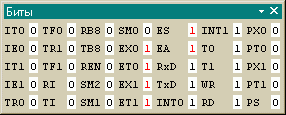 Данное окно предназначено для работы с битами процессора. Биты могут принимать только два значение “Ноль” и “Единица”. Изменение с “Нуля” на “Единицу” и наоборот производится щелчком мыши по соответствующей ячейке. Изменившиеся значения для удобства восприятия, выделяются красным цветом. Размеры окна можно изменить с помощью “мыши”. Количество ячеек в столбце и количество столбцов будет выбрано таким образом, чтобы окно максимально соответствовало выбранному размеру. Нажав на окне правую кнопку “мыши” и выбрав пункт “всплывающего” меню “Свойства” можно настроить какие биты отображать, и какие подписи для них использовать.