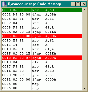 В этом окне отображен дизассемблерный текст программы – третья часть, а также смещение и код команды – первая и вторая часть соответственно. Зеленым цветом подсвечена инструкция, адрес которой соответствует значению указателя инструкций для текущего процессора (например, в данной модели микроконтроллера VE51, указателем инструкций является PC). Так же в этом окне можно устанавливать/снимать точки останова, данная операция осуществляется двойным щелчком левой кнопки “мыши” на коде инструкции при достижении которой надо прекратить выполнение. Установленная точка останова отображается красным цветом. Двойной щелчок левой кнопки “мыши” на адресе инструкции приводит к выполнению программы до этого адреса. Однако если в процессе выполнения встретится точка останова, то произойдет останов в том месте, где она установлена. Справа находится “полоса прокрутки” с помощью которой можно изменить адрес дизассемблируемого участка памяти. Высота “ползунка” соответствует объему отображаемой памяти. Адрес можно изменить и путем ввода смещения в левую колонку окна. Исполняемый код можно подправить во второй колонке окна дизассемблера. Для принятия изменений надо нажать “Enter”, если необходимо отказаться от изменений, то следует нажать “Esc”. При редактировании шестнадцатеричных данных и вводе смещения производится контроль ввода, если вводится недопустимый символ, то подается звуковой сигнал.