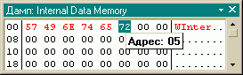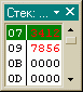 Это окно служит для просмотра и редактирования стека, оно состоит из двух частей, слева – адрес ячейки стека, справа – содержимое этой ячейки. Зеленым цветом подсвечена строка, адрес которой соответствует значению указателя стека для текущего процессора (например, в данной модели микроконтроллера VE51, указателем стека является регистр SP). Размеры окна можно изменить с помощью “мыши”. Количество ячеек в строке и количество строк будет выбрано таким образом, чтобы окно максимально соответствовало выбранному размеру. Изменившиеся в процессе исполнения ячейки стека отображаются красным цветом. Справа находится “полоса прокрутки” с помощью которой можно изменить адрес участка памяти отображаемой в окне. Высота “ползунка” соответствует объему отображаемой памяти. Для редактирования стека надо “кликнуть” на нужную ячейку, ввести значение и нажать “Enter”, для отказа от изменений следует нажать “Esc”.