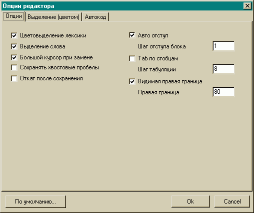 Нажав правую кнопку “мыши” на окне и выбрав пункт “всплывающего” меню “Свойства”, можно настроить редактор максимально удобным для себя способом, включая синтаксическую подсветку. Нажатие кнопки “По умолчанию” приведет к использованию данных настроек для любого файла заданного типа.